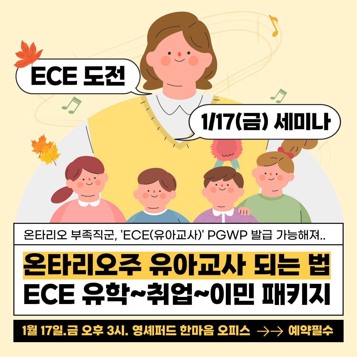 한마음 캐나다가 다가오는 1월 17일(금) <온타리오주 ECE 유아교사 되는 법 | 유학, 취업, 영주권까지>를 주제로 한 세미나를 개최합니다. 아쉽게도 해당 세미나는 오프라인 세미나로, 온타리오주 토론토 영셰퍼드 오피스에서 진행되는 점 양해 부탁드립니다. 온타리오에서 ECE 유아교사는 대표 부족직군으로 선정되어 캐나다 영주권 취득을 위한 기회가 될 수 있습니다.