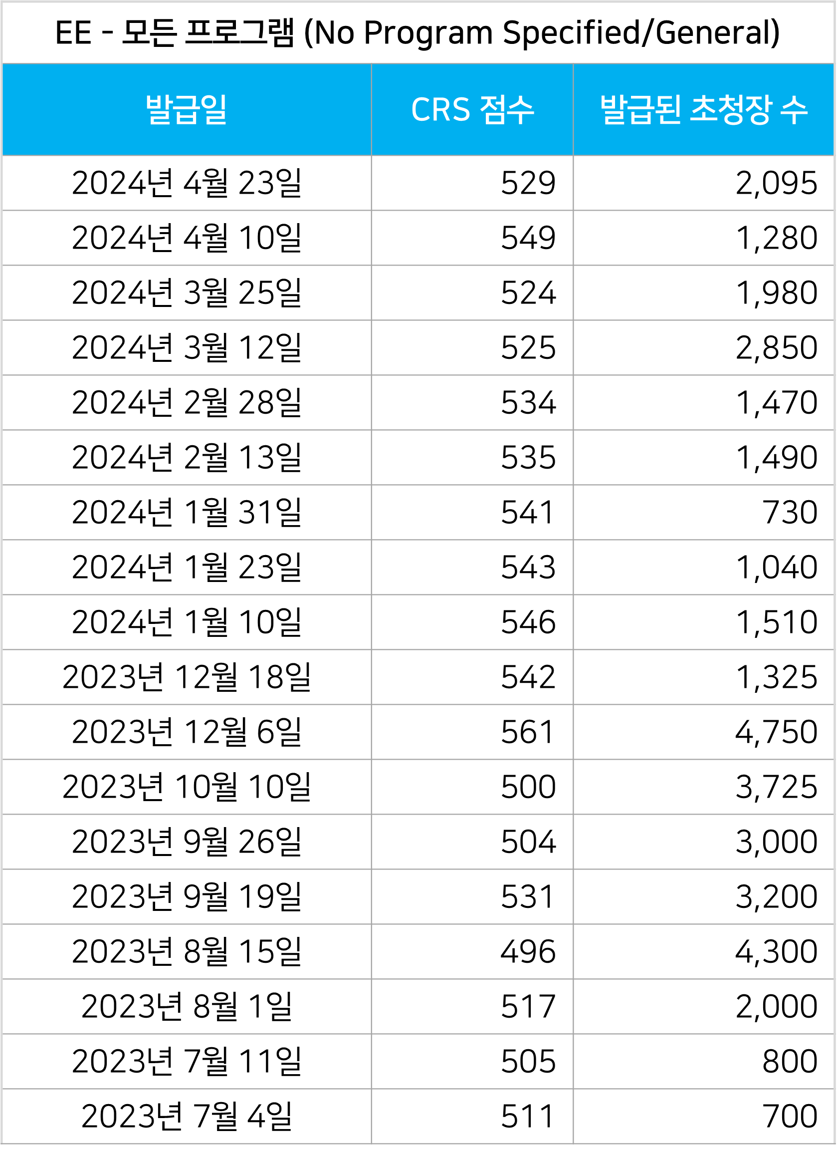 지난 4월 23일, 익스프레스 일반 선발 529점으로 선발된 이후로, 현재까지 추가 선발 소식은 없습니다. 카테고리 타겟 선발 또한 지난 4월 24일 프랑스어 능통자 카테고리에서 410점의 선발 이후로 추가 선발 소식이 발표되지 않았습니다. 5월의 EE 선발 소식이 발표될 지의 여부는 한마음 캐나다와 함께 확인하세요.