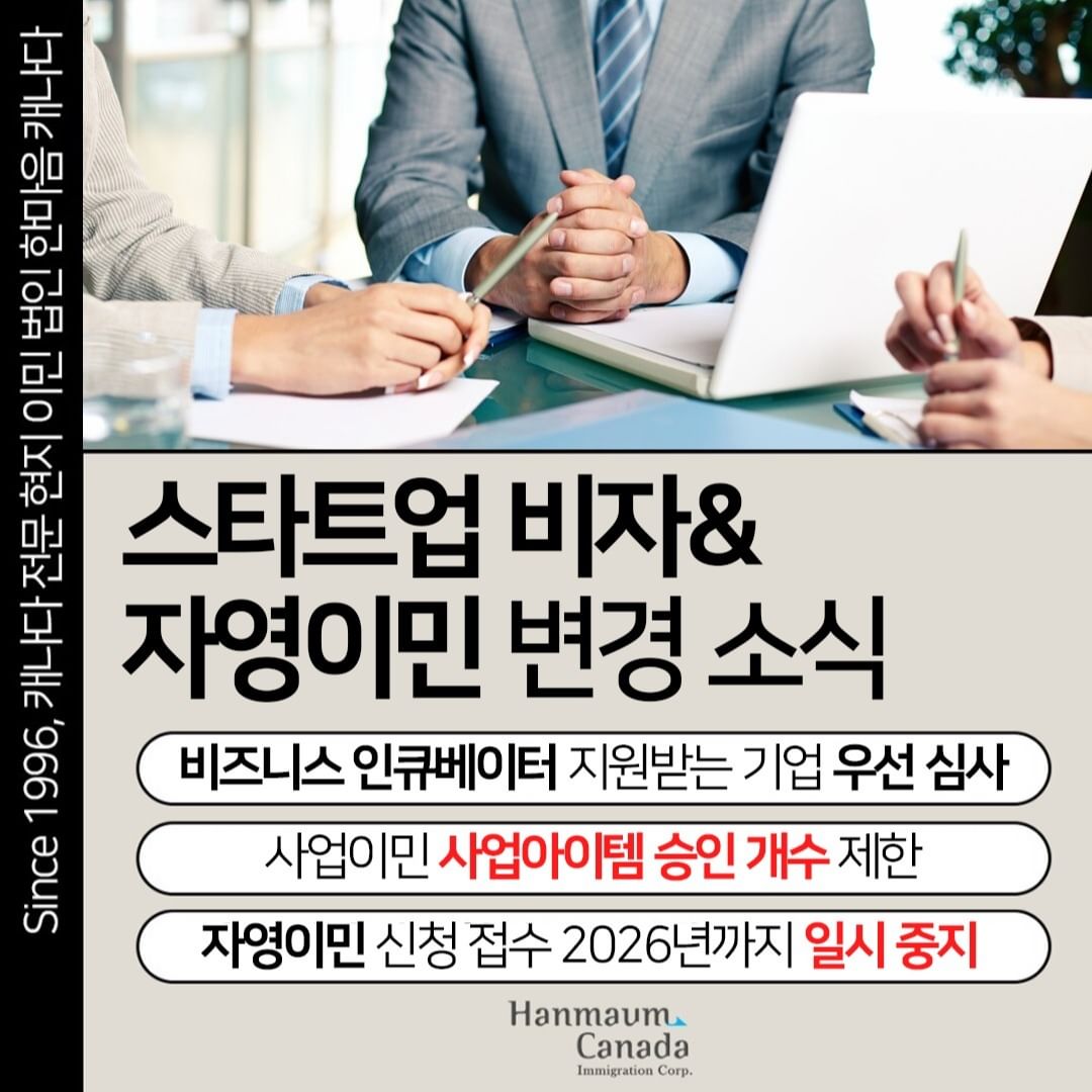 지난 4월 29일, 캐나다 이민부에서 적체된 신청서의 처리 시간 단축을 목적으로 '스타트업 비자'와 '자영이민' 관련 중요한 변경사항을 발표하였습니다. 변경사항은 크게 2가지로, 발표 바로 다음 날인 4월 30일부터 적용되었습니다.