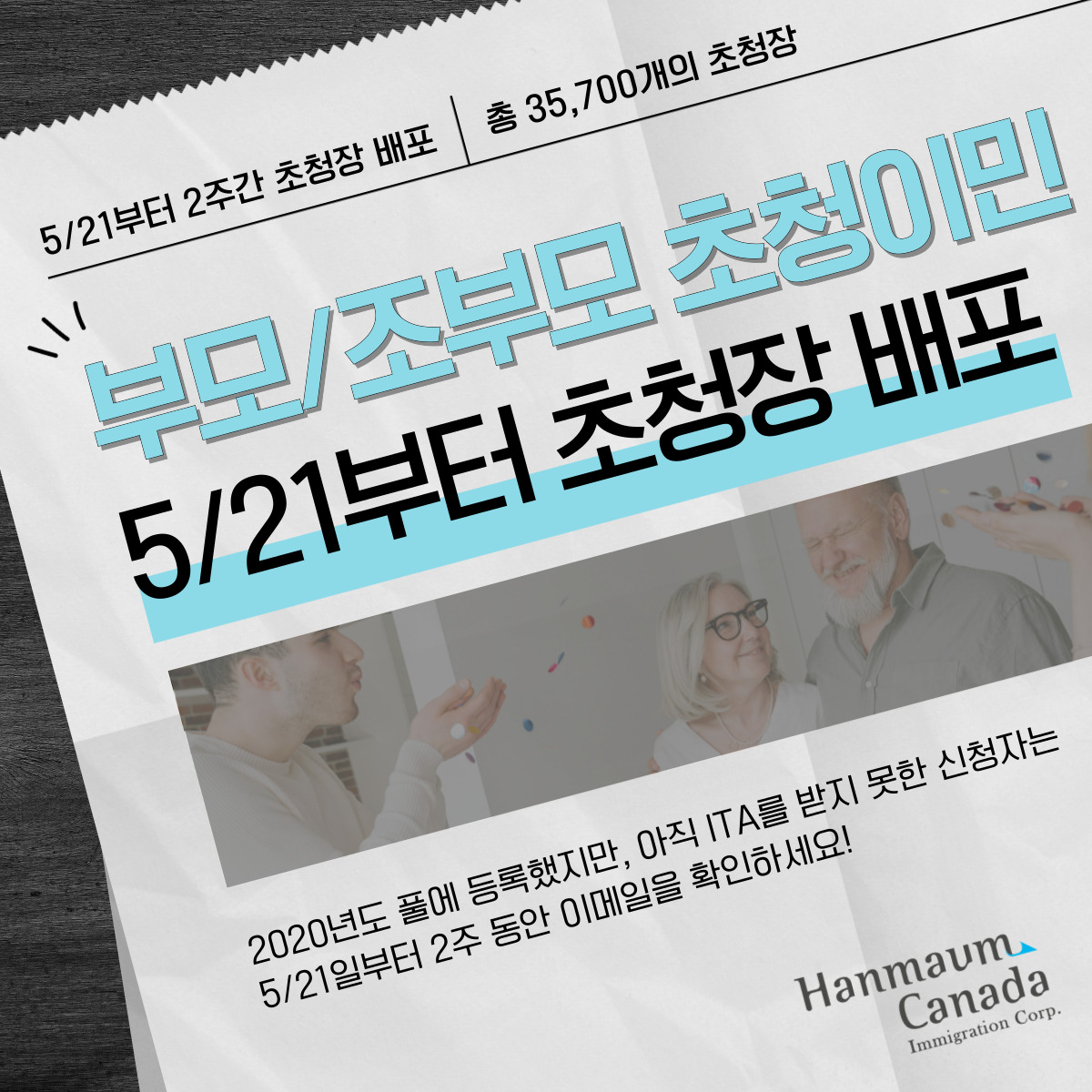 금일 5월 21일부터, 2024년 부모/조부모 초청이민이 재개됩니다. 21일부터 2주 동안 35,700개의 초청장이 배포될 예정이며, 이 중 20,500개의 영주권 신청을 승인할 예정입니다.