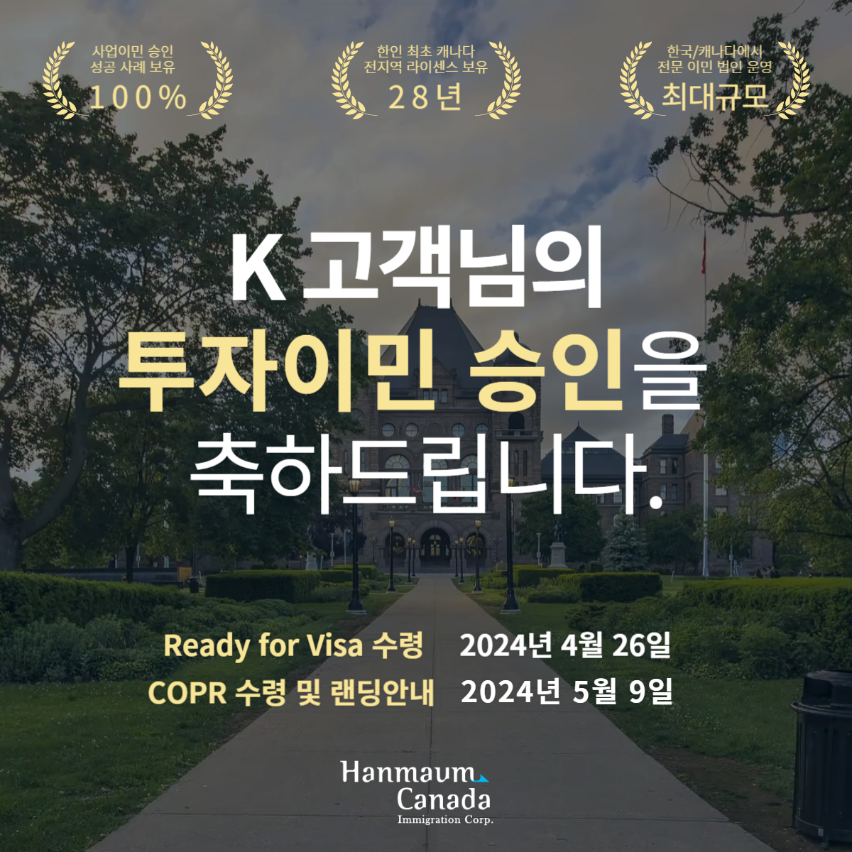 한마음의 K 고객님께서 투자이민을 통해 COPR 승인을 받으셨습니다!👏