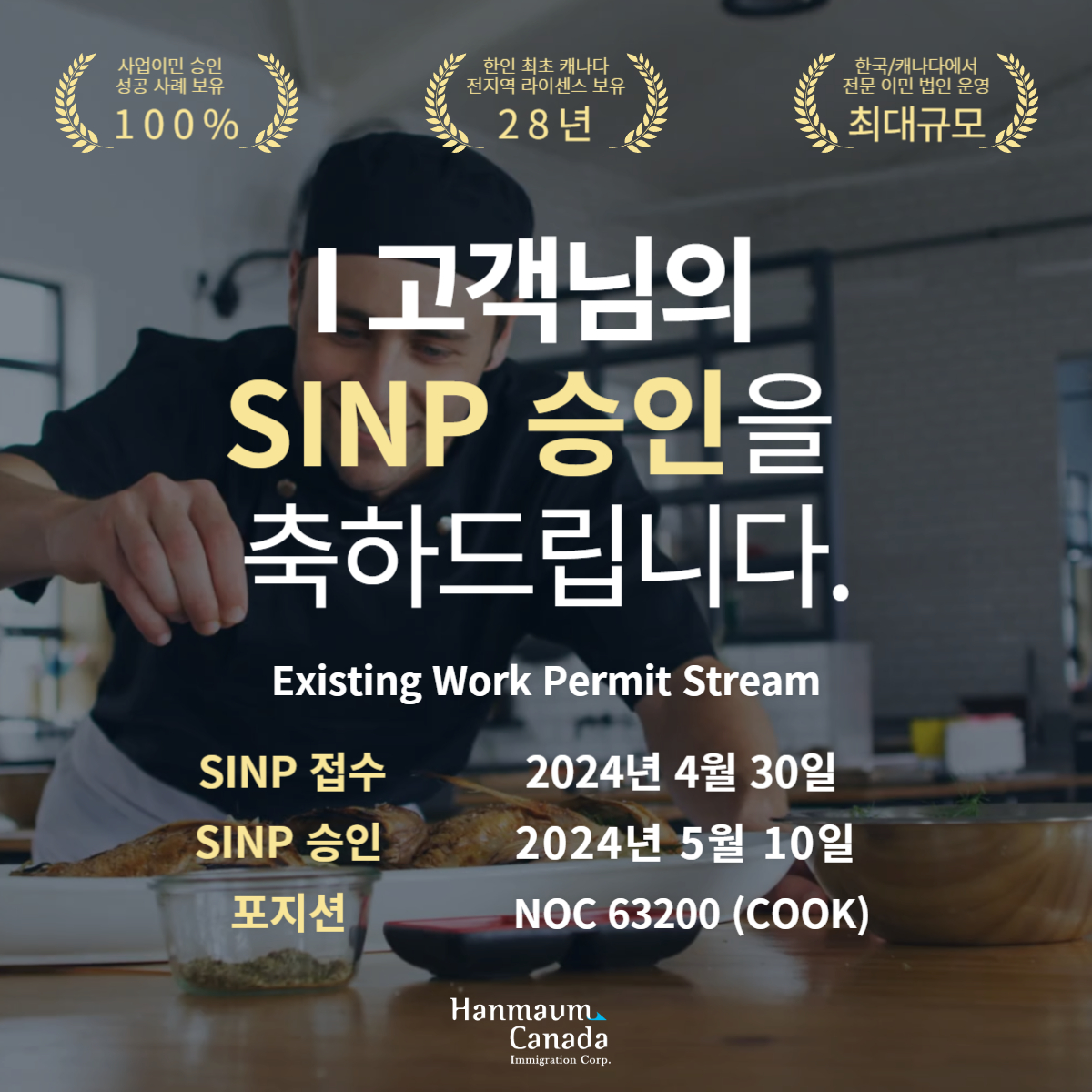 👏 NOC 63200 쿡 포지션으로, SINP 접수 후, 단 10일 만에 승인 받으셨습니다.