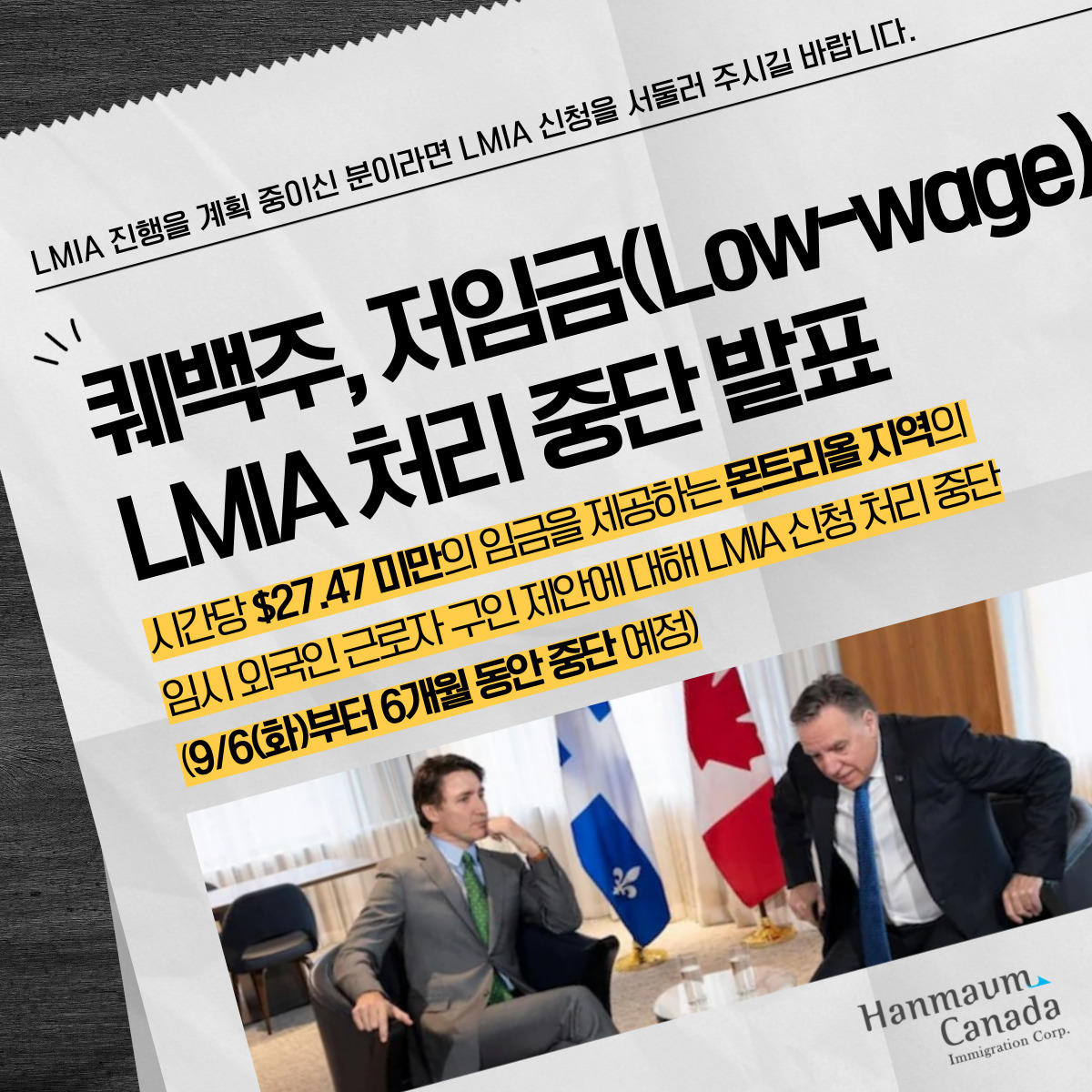 ํ๋ง์์ ์ง๋ 8์ 6์ผ, ๊ณ ์ฉ ๋ฐ ๋ ธ๋๋ ฅ ๊ฐ๋ฐ, ๊ณต์ฉ์ด ์ฅ๊ด์ธ Randy Boissonnault์ ์์ ์ธ๊ตญ์ธ ๊ทผ๋ก์๋ฅผ ๊ณ ์ฉํ๊ธฐ ์ํด ์ฌ์ฉํ๋ LMIA์ ๋ํ ์บก ์ ์ฉ/์์๋ฃ ์ธ์/๊ฐ๋ ๊ฐํ ์๊ณ ๋ฐํ๋ฅผ ๊ณต์ ๋๋ฆฐ ๋ฐ ์์ต๋๋ค. LMIA Low-wage ๋์ ์ฒ๋ฆฌ ๊ฑฐ๋ถ๋ฅผ ์ํํ๋ ๊ฒ์ ๊ณ ๋ คํ๊ณ ์๋ค๋ ๋ด์ฉ์ ์ ํด๋๋ฆฐ ๋ฐ ์์ง์? ํด๋น ๋ฐํ๊ฐ ๋์ง ์ผ๋ง ๋์ง ์์, ํ๋ฐฑ์ฃผ ๋ชฌํธ๋ฆฌ์ฌ์์ Low-wage LMIA ์ ์ฒญ์ ์ฒ๋ฆฌ ์ค๋จ ๋ฐํ๊ฐ ์ผ๋ง ๋์ง ์์ ๋ฐํ๋ ๊ฒ์ธ๋ฐ์. LMIA ์งํ์ ๊ณํ ์ค์ด์ ๋ถ์ด๋ผ๋ฉด LMIA ์ ์ฒญ์ ์๋๋ฌ ์ฃผ์๊ธธ ๋ฐ๋๋๋ค.